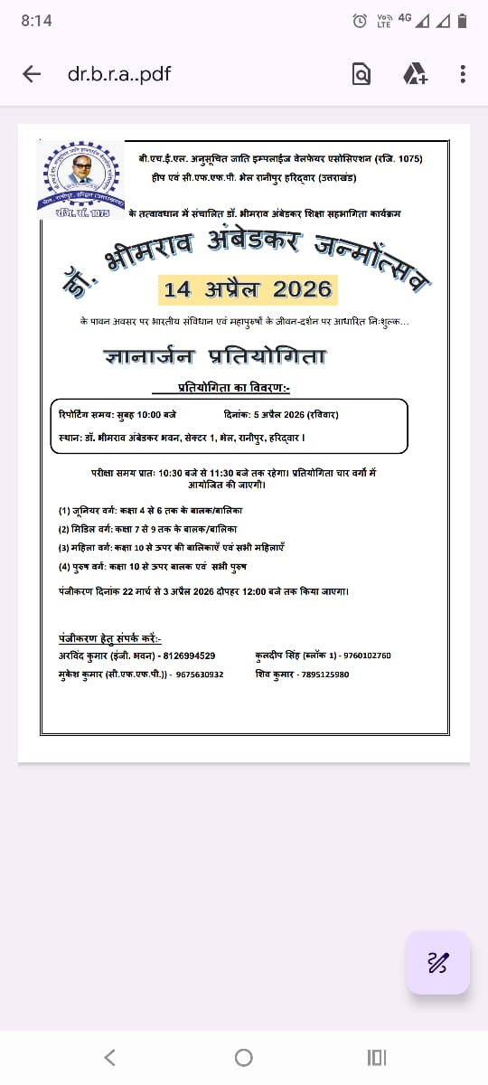 हरिद्वार। जय भीम जय भारत जय भारत का संविधान सम्मानित साथियों जैसा कि आपको जानकारी है की 5 अप्रैल 2026 को डॉ भीमराव अंबेडकर भवन सेक्टर 1 में एक ज्ञानर्जुन प्रतियोगिता का आयोजन किया जा रहा ह जिसमें बाबा साहब डॉक्टर भीमराव अंबेडकर से संबंधित व संविधान भारत के संविधान से संबंधित अन्य महापुरुषों से संबंधित प्रश्न उत्तर पूछे जाएंगे इसमें बच्चे बालिकाएं महिलाएं एवं हर उम्र के सभी व्यक्ति भाग ले सकते हैं यह प्रतियोगिता बाबा साहब डॉक्टर भीमराव अंबेडकर जी के जन्म उत्सव 14 अप्रैल 2026 के उपलक्ष में रखी गई है जिससे सभी सम्मानित साथियों को बाबा साहब को पढ़ने का मौका मिलेगा क्योंकि हम सभी को किसी भी स्कूल में या कॉलेज में भारत के संविधान को या बाबा साहब की जीवनी को नहीं पढ़ाया गया है बाबा साहब वह शख्सियत हैं जिनका जन्मदिन विश्व के लगभग 100 देश में मनाया जाता है ऐसे ही विश्व रतन बाबा साहब डॉक्टर भीमराव अंबेडकर जी को हमें परीक्षा के माध्यम से अवश्य पढ़ाना चाहिए क्योंकि जब हम किसी प्रतियोगिता में भाग लेते हैं तो हमारे अंदर उनको पढ़ने की एक ऊर्जा पैदा होती है इसीलिए सभी से अनुरोध है की सभी सम्मानित साथी इस प्रतियोगिता में अवश्य ही भाग ले क्योंकि बाबा साहब डॉक्टर भीमराव अंबेडकर के महान त्याग के कारण ही हमारे पास आज शिक्षा स्वास्थ्य रोजगार मान सम्मान गाड़ी बांग्ला सभी कुछ बाबा साहब के कठिन संघर्ष के कारण ही है इसीलिए हमारा परम कर्तव्य बनता है कि हम सभी 5 अप्रैल को होने वाली प्रतियोगिता जो डॉक्टर भीमराव अंबेडकर भवन सेक्टर 1 में आयोजित की जा रही है उसमें अवश्य ही भाग ले धन्यवाद