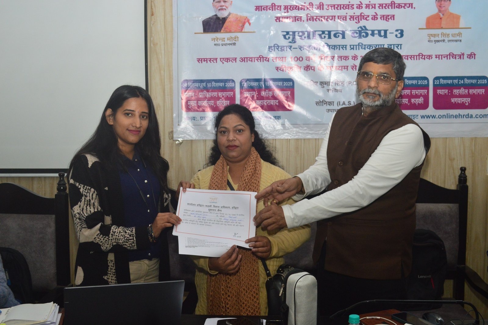 हरिद्वार। माननीय मुख्यमंत्री श्री पुष्कर सिंह धामी के सरलीकरण, समाधान, निस्तारण एवं संतुष्टि के मंत्र को आगे बढ़ाते हुए हरिद्वार–रुड़की विकास प्राधिकरण (HRDA) द्वारा आज सुशासन कैंप का सफल आयोजन ब्लॉक सभागार बहादराबाद हरिद्वार में किया गया। इससे पूर्व भी दो सुशासन कैंप आयोजित किए जा चुके हैं। कैंप में बड़ी संख्या में आवेदक अपनी विभिन्न समस्याओं के समाधान हेतु पहुँचे। आज के कैंप में सचिव HRDA श्री मनीष कुमार सिंह, संयुक्त सचिव श्री दीपक रामचंद्र सेठ, अधीक्षण अभियंता श्री राजन सिंह, सहायक अभियंता श्रीमती वर्षा, सहायक अभियंता श्री प्रशांत सेमवाल, टेक्निकल कंसल्टेंट श्री गोविंद, अवर अभियंता एवं अन्य संबंधित अधिकारी उपस्थित रहे। उपाध्यक्ष श्रीमती सोनिका द्वारा विभिन्न मामलों की समीक्षा करते हुए अधिकारियों को निर्देश दिए कि सभी आवेदकों की समस्याओं का त्वरित, पारदर्शी एवं संतोषजनक निस्तारण सुनिश्चित किया जाए ताकि आम जनता को वास्तविक रूप से सुशासन का लाभ प्राप्त हो सके।